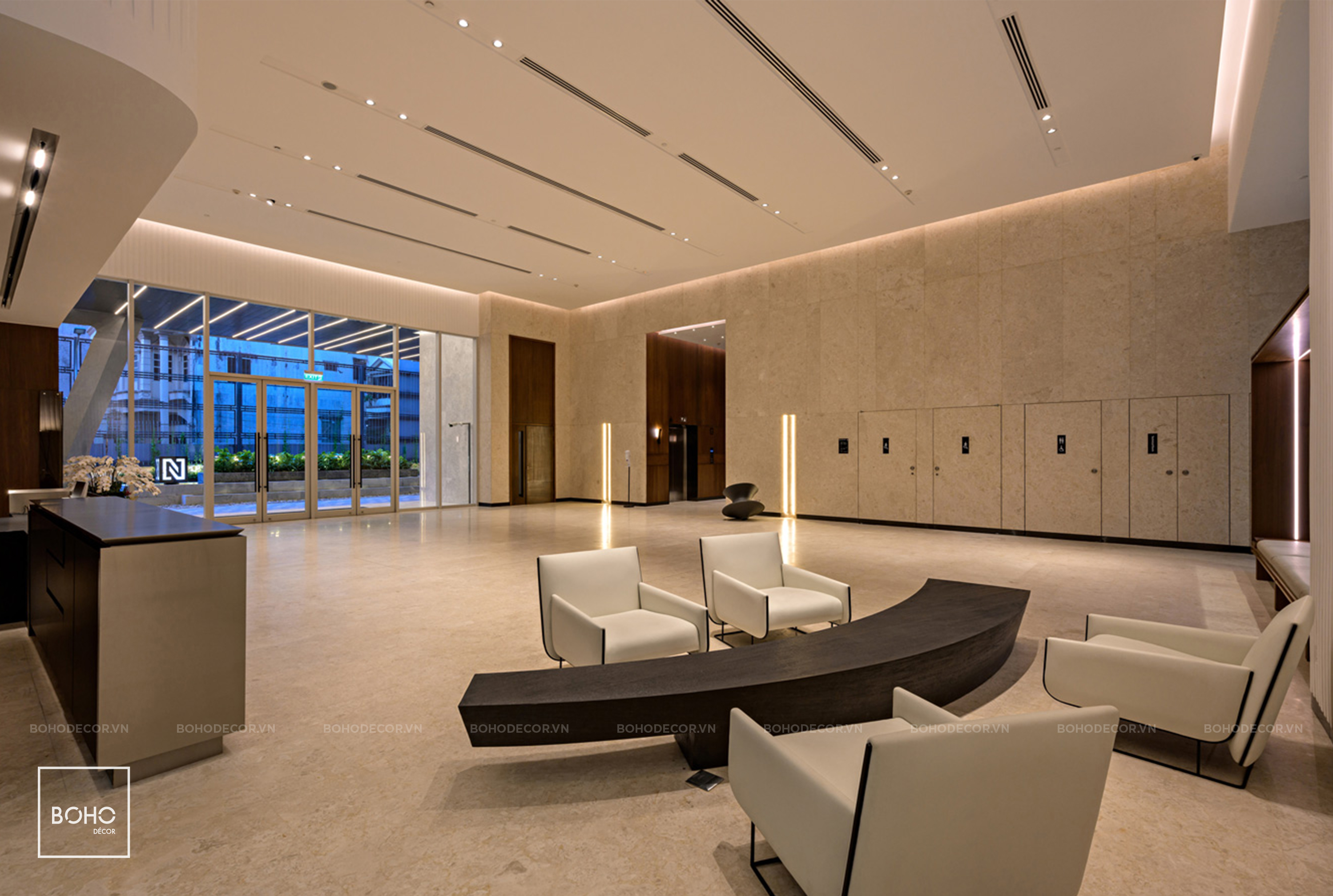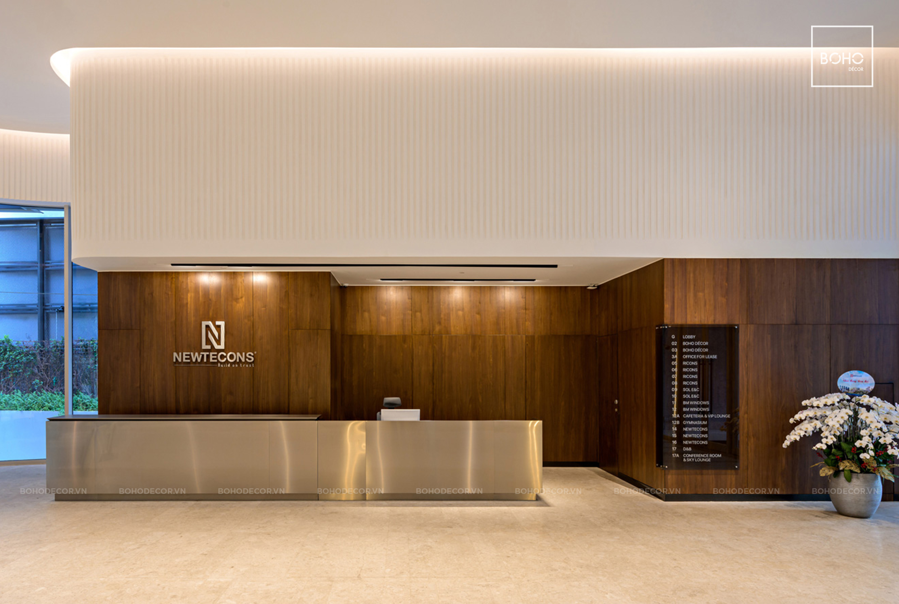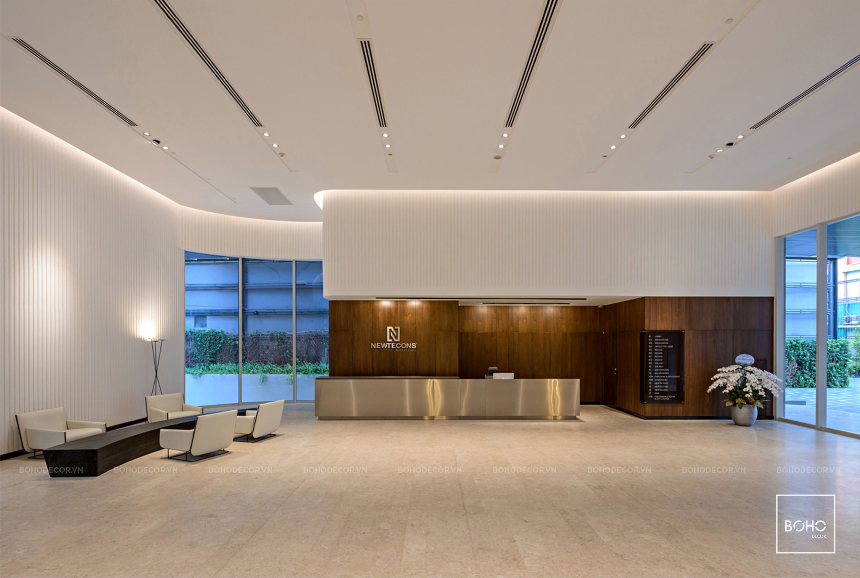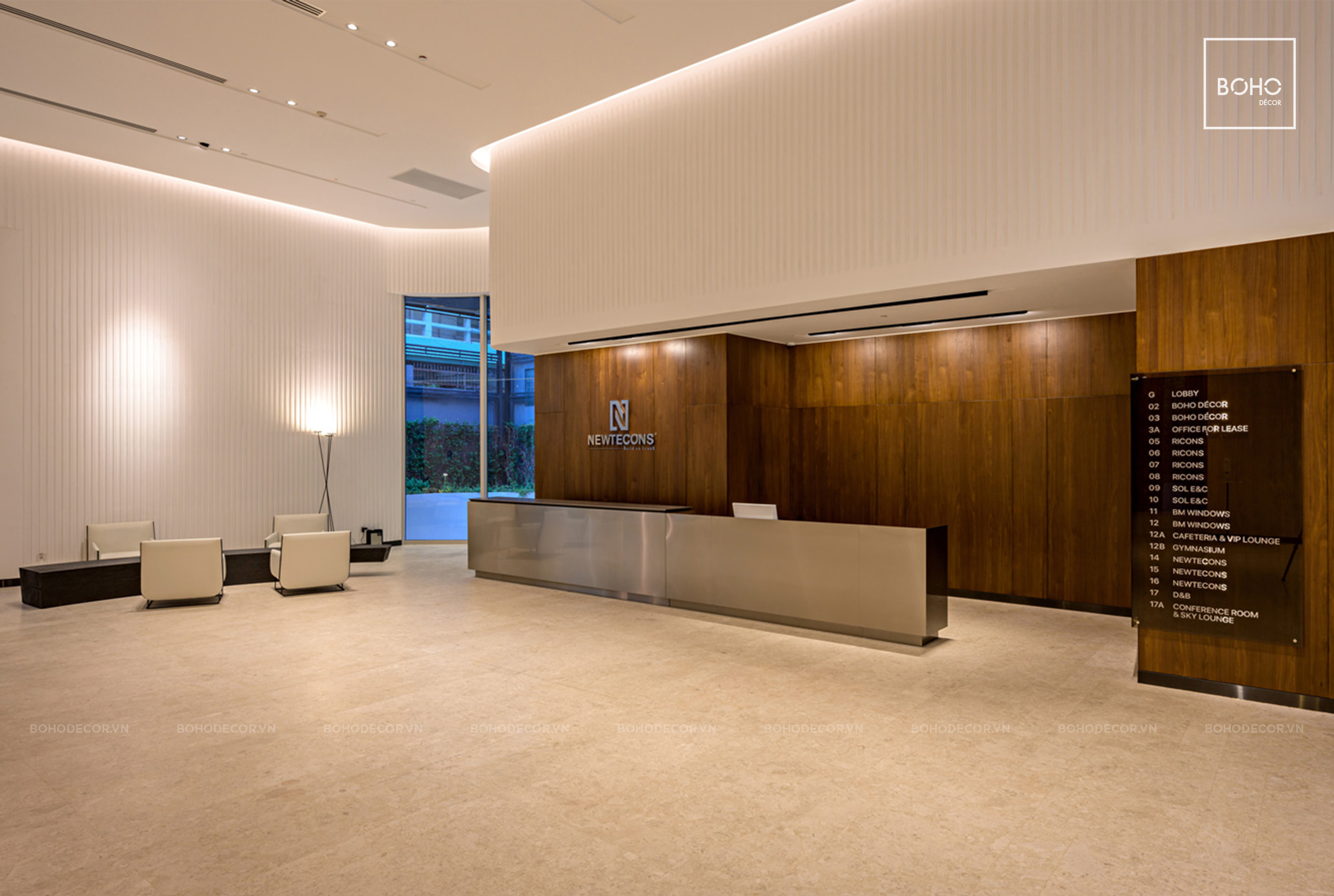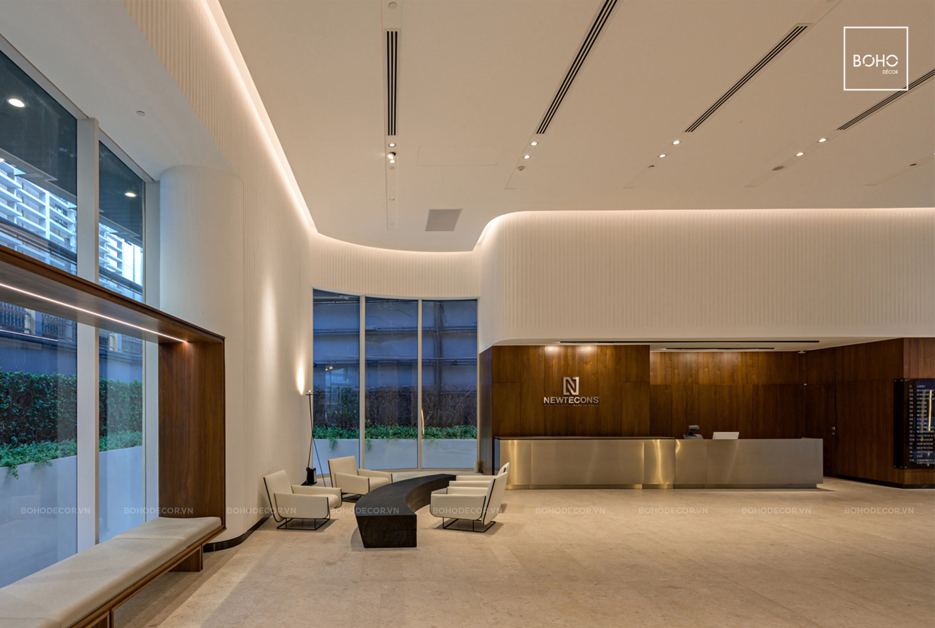 Xuất phát từ ý tưởng theo lối thiết kế hiện đại kết hợp tone màu trung tính, ấm áp gợi nhắc về chân giá trị Tập đoàn Newtecons, thông qua sảnh chính tòa nhà, BOHO đã tạo nên một tổng thể hài hòa nhưng không kém phần sang trọng, chỉn chu mang theo nét đặc trưng vốn có.