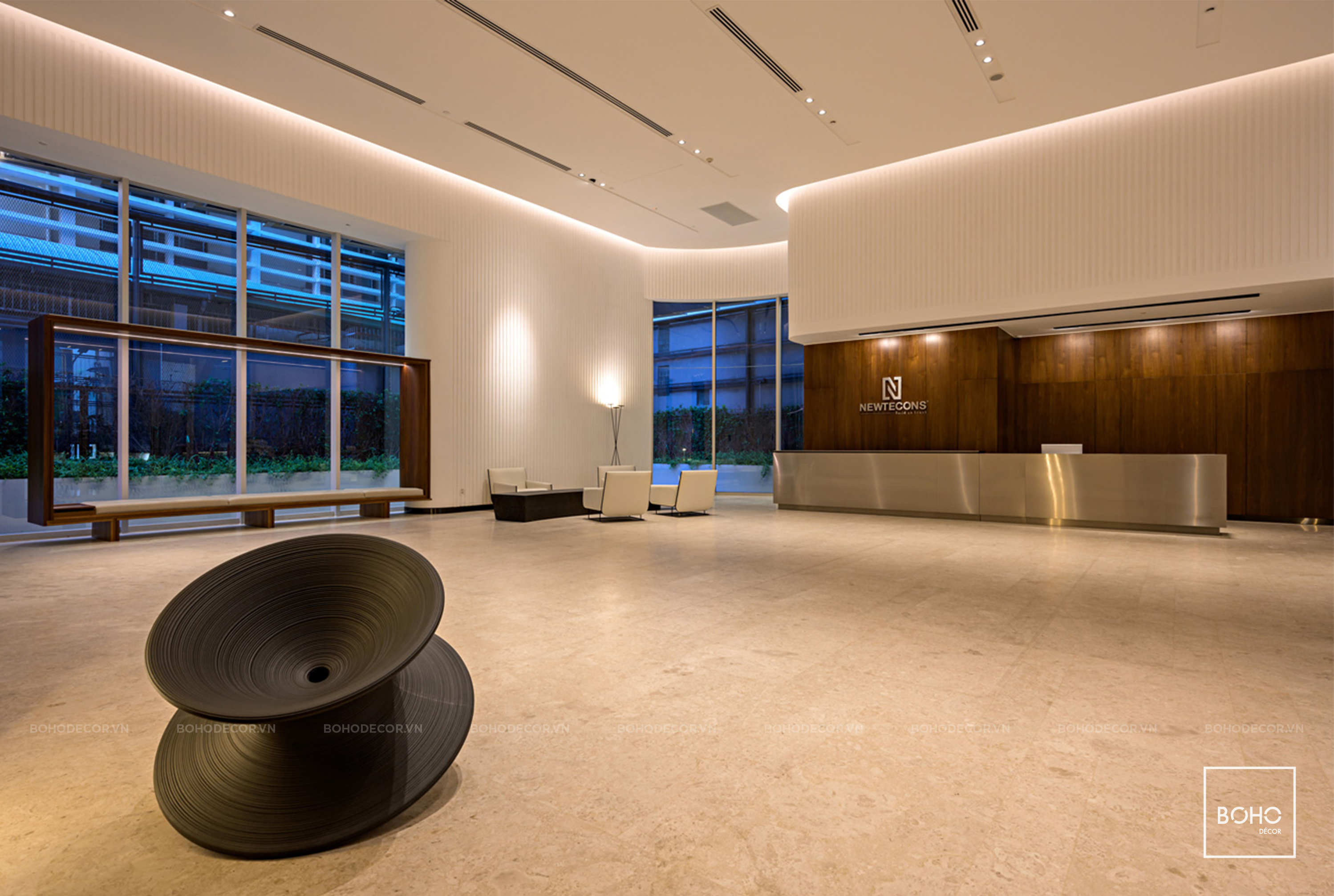 Through the void design, the reception lounge of the Newtecons building immediately gains an overwhelming impression of natural and artificial light. In addition, BOHO also focuses on developing details and using high-class materials such as veneer and Oman stone Limestone line.