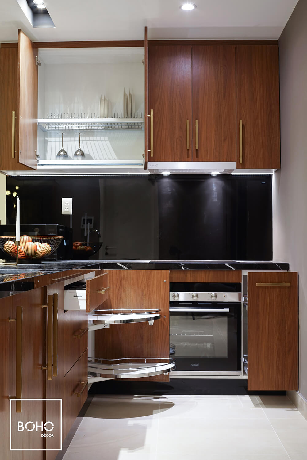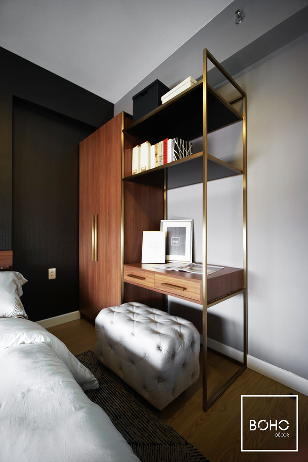 Gỗ mang đến sự sang trọng và cổ điển cho cả không gian sống khi là vật liệu chủ đạo ở phòng khách, phòng ngủ, nhà bếp với các sắc độ khác nhau.Với thiết kế hình học cơ bản, vật liệu gỗ ở các bề mặt được xử lý tinh xảo, nhẵn mịn và bóng mượt. Các sắc độ khác nhau của vân gỗ, từ nâu sáng đến nâu sậm, được sử dụng xen kẽ với các vật liệu khác như đá marble, gạch bông, thảm hay kim loại. Điều này giúp tổng thể không gian mang nét sang trọng, cổ điển và vô cùng thanh lịch.Để tôn thêm nét phong trần của các vân gỗ, màu sắc chủ đạo trong nhà đều có tông màu trung tính và màu đậm. Kết hợp với các vật dụng nội thất được thiết kế tối giản và hệ thống đèn, không gian nhà trở nên có chiều sâu, cân bằng được các khoảng sáng-tối và luôn tạo được nét hài hòa tổng thể.Từ nhà bếp, phòng khách đến mỗi phòng ngủ, gỗ được sử dụng kết hợp với các vật liệu khác như đá marble, gạch bông, thảm và kim loại, được mài giũa nhẵn mịn bề mặt và ốp sát tường. Lối thiết kế này giúp không gian có được tinh thần hiện đại, phóng khoáng nhưng lại có cảm giác ấm cúng cần thiết.Màu sắc chủ đạo là tông màu trung tính được biến hóa tùy theo chức năng của mỗi khu. Dù kết hợp cùng ánh sáng tự nhiên vào ban ngày hay hệ thống đèn vào ban đêm, tổng thể căn hộ vẫn giữ được sự hài hòa, thanh thoát và dễ chịu, giúp người ở luôn cảm thấy tràn đầy sức sống, hồi phục năng lượng dễ dàng sau một ngày dài.
